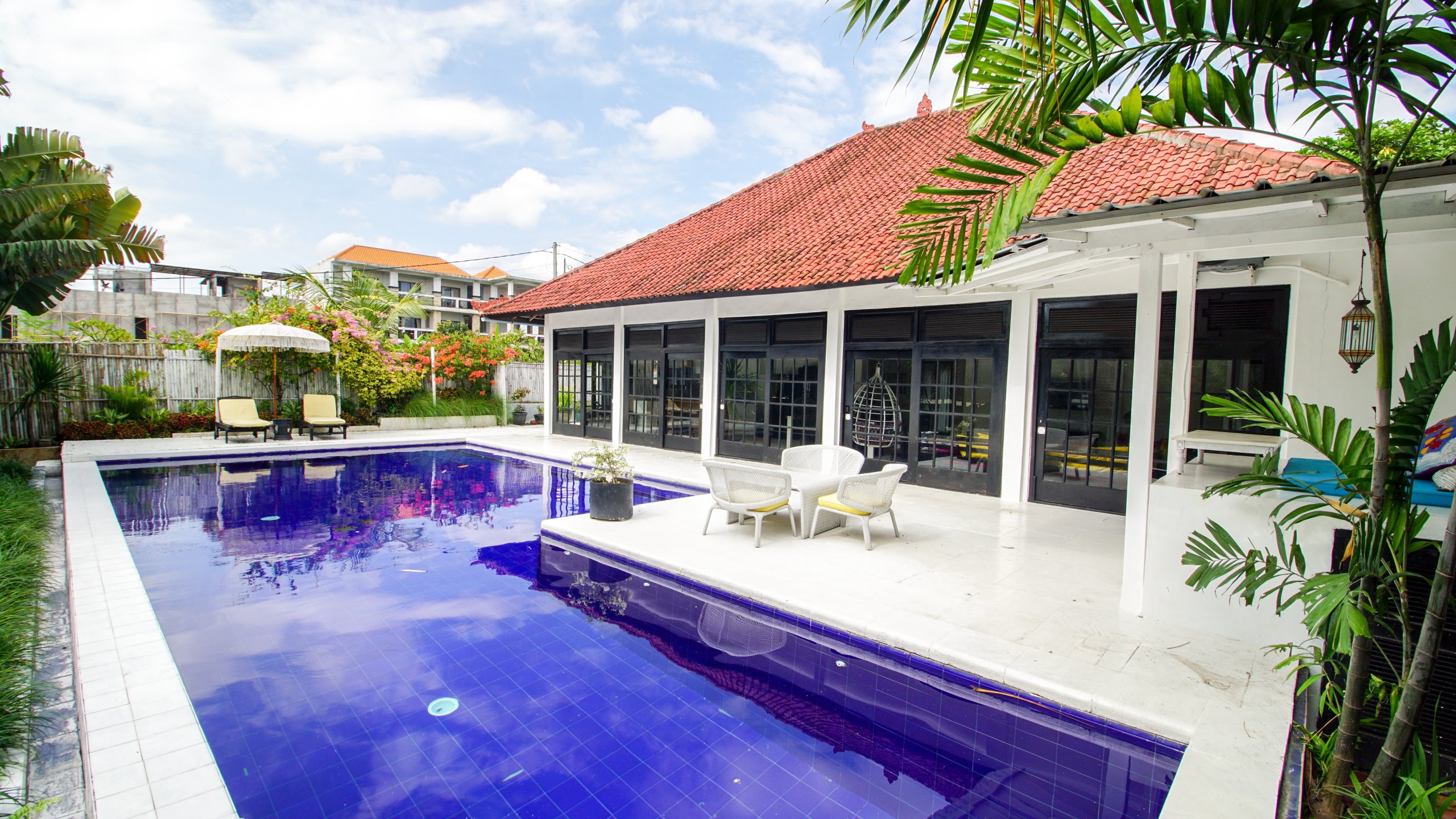 Welcome to 4 bedroom villa in central Canggu, just a stone’s throw from the vibrant energy of Batu Bolong Beach and the eclectic dining scene of trendy restaurants. This 4-bedroom villa combines spaciousness with tropical charm, offering a perfect blend of indoor comfort and outdoor tranquility. As you enter, you’re greeted by a sprawling outdoor area enveloped in lush tropical greenery. The garden, adorned with swaying palms and colorful blooms, sets the stage for relaxation and al fresco enjoyment. A large swimming pool beckons, inviting you to cool off or bask in the Bali sun on comfortable loungers. Step inside to discover the villa’s enclosed living area, thoughtfully designed for seamless indoor-outdoor living.