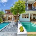 This Modern Balinese 7 Bedroom Villa is located in a quiet location in Umalas, takes only 5 to 10 minutes from Seminyak and the beach. modern and traditional construction, spacious.This villa is situated close to seminyak 5 minutes from restaurants, bars and beach. Entry to the complex is through a set of large double, antique Javanese wooden gates (Gebyok) that open to a spacious, mature lawn with gardens and a 14-meter-long swimming pool. Stepping up a staircase to a colonial-feeling front terrace leads you to semi-open dining room and elegant air-conditioned living room with a back terrace—all overlooking a courtyard setting garden. This villa was first built as a family house in Umalas in 1992. The house was the venue of the “Bali White Party” in 1998 and host several world famous artists, It was then transformed into a rental villa.The semi-modern Balinese colonial style building of 600 square meters sits on a 1700 m2 block of land. Fully refurbished in 2022. The architecture features a blend of modern and traditional elements, boasting 7 spacious bedrooms with ensuite bathrooms. Open air Terraces and living and dining rooms; Air-conditioning reading room.