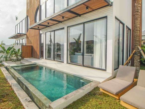 Luxurious Villa with Rooftop Plunge Pool in Lyma Beach, Pererenan. Indulge in luxury at this stunning 4-bedroom villa, located just 1 minute from Pererenan Beach. With a beautiful rooftop plunge pool and a spacious swimming pool with sunbeds, this villa offers the perfect blend of relaxation and elegance. 4 spacious bedrooms with king-sized beds and ensuite bathrooms, Enclosed living room with a stylish sunken lounge, AC, and dining area, Fully equipped modern kitchen, Rooftop plunge pool – ideal for sunset views , Large swimming pool with sunbeds for ultimate relaxation