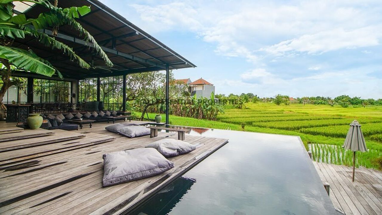 Located in Beraban, Tanah Lot. This new villa concept and unique “Villa “ is located in the middle of the rice fields on 1,283 m2 of land and 507 m2 of building size.Situated at the end on a private gang gives a peaceful and quiet environment. The position is still close enough to the beach (Kedunggu beach), shops, and restaurants in Canggu only drive 15 minutes from this villa.The structure is made of metal H-bean as the original Villa. The concept is a large open living room facing the trees and the river, surrounded rice field view beyond. A dining area and a fully equipped kitchen are behind. This lovely 4-bedroom en-suite faces a directly L-shaped swimming pool with a pool deck and comfortable sunbeds. Every detail and material has been our priority to create this loft concept. Now available for rent in Beraban Tanah Lot.
